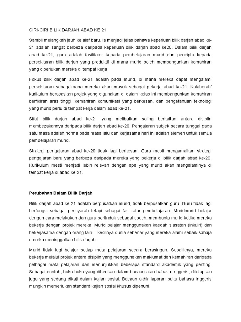 Ciri Ciri Bilik Darjah Abad Ke 21 Pdf